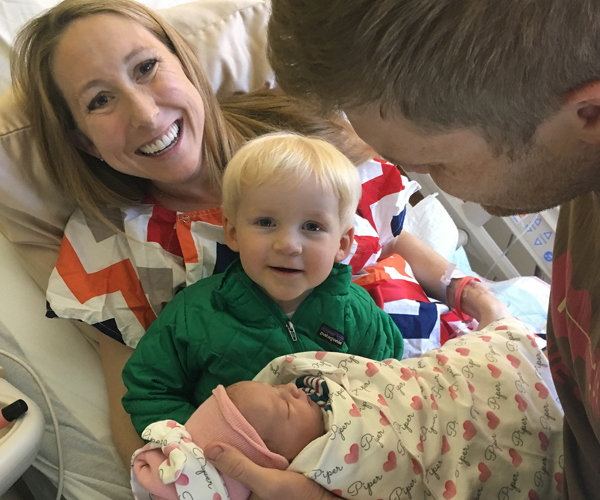 For my second baby, Dr. Morgan wasn’t delivering babies anymore, so we had Dr. Ali Hunt. We absolutely loved her. Pre-labor, she told me, “As soon as you feel anything, you come in,” because the other one was so fast. She gave my husband her cell number and told him to text her when labor started. I remember, it was Sunday and we’d just finished dinner. I was feeling a little tired and a bit crampy. Sean was ready to go. First, I said, “No,” and then, “okay.”